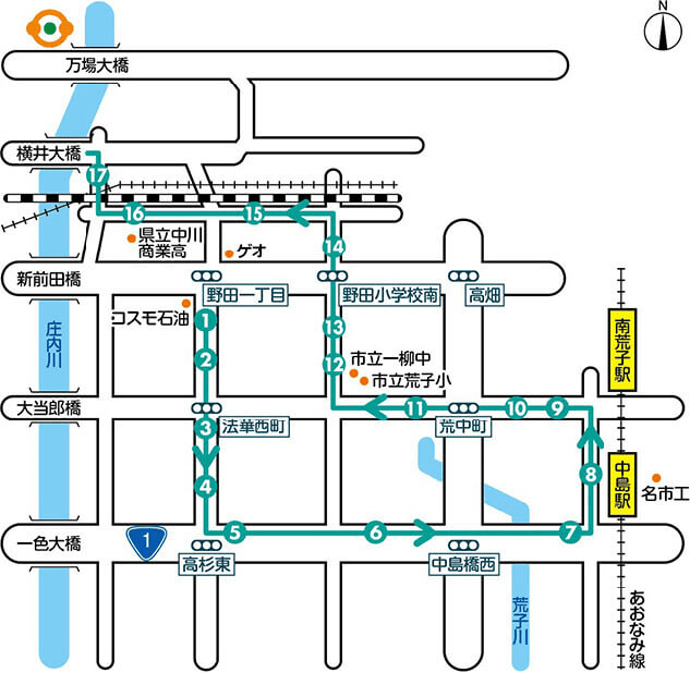 | 17 | あやめ接骨院 | 8:37 | 10:47 | 12:47 | 14:47 | 16:47 | 17:47 |