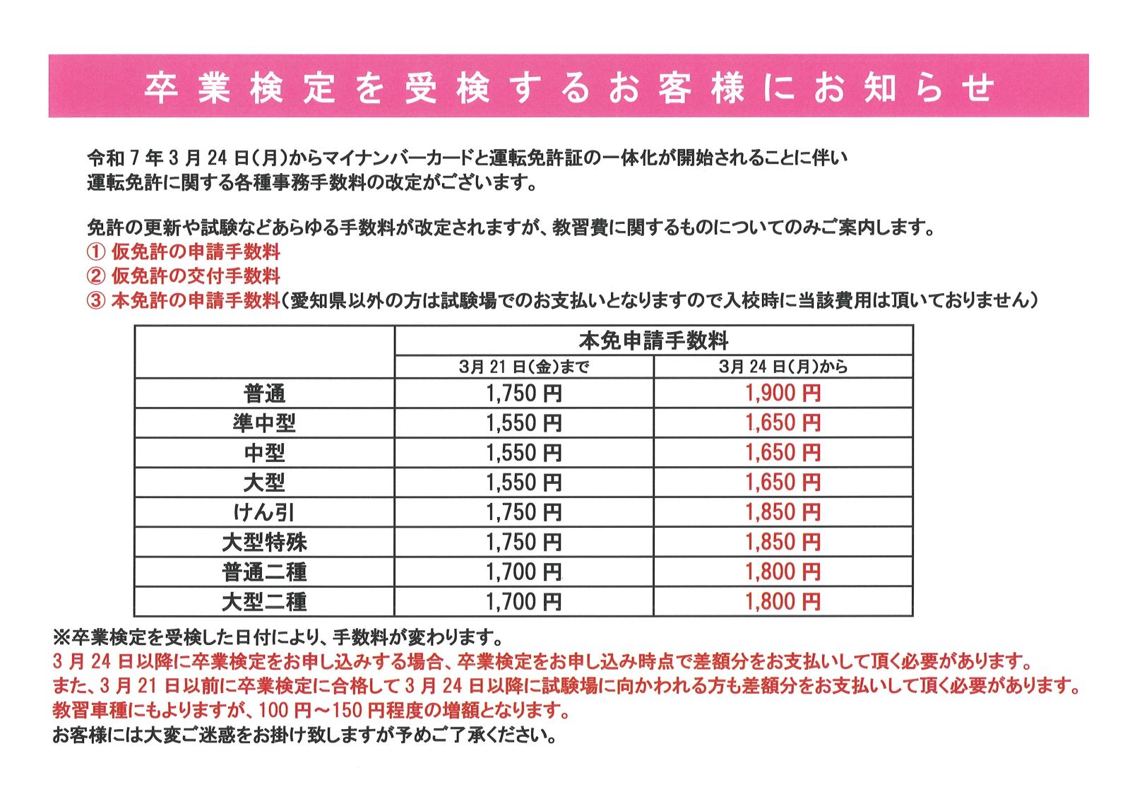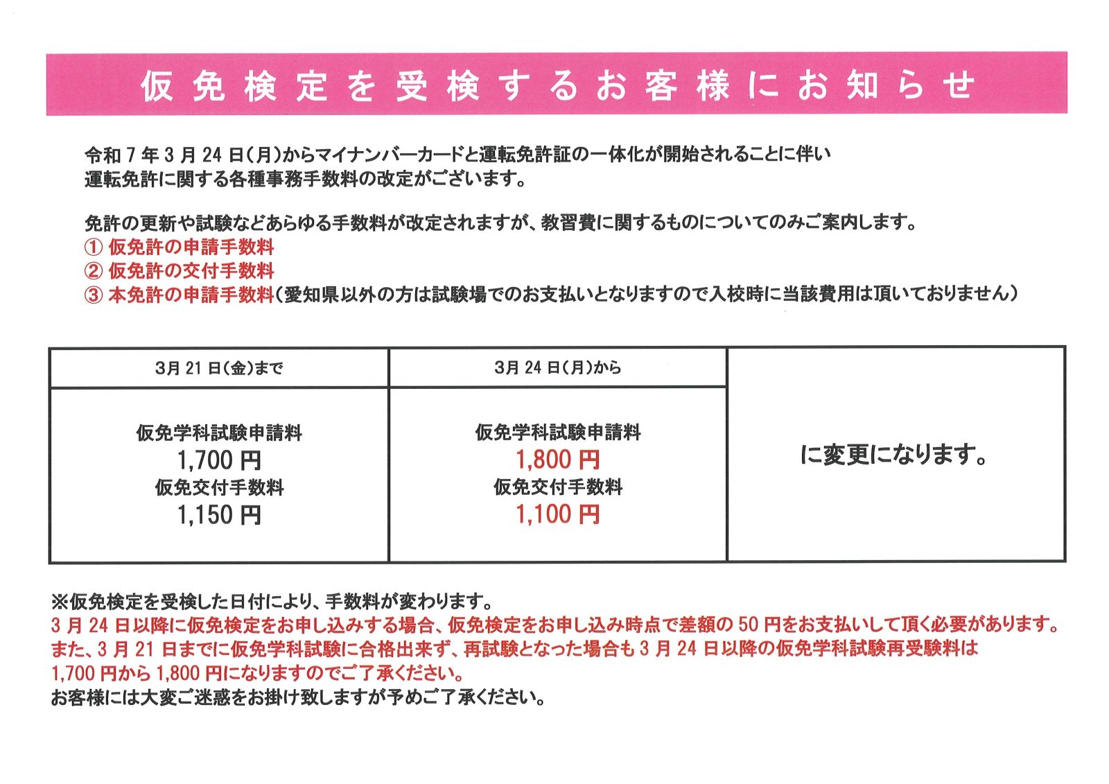 2025年03月01日 事務手数料の改正について 令和7年3月24日(月)からマイナンバーカードと運転免許証の一体化が開始されることに伴い運転免許に関する各種事務手数料の改定がございます。 « 一覧へ戻る