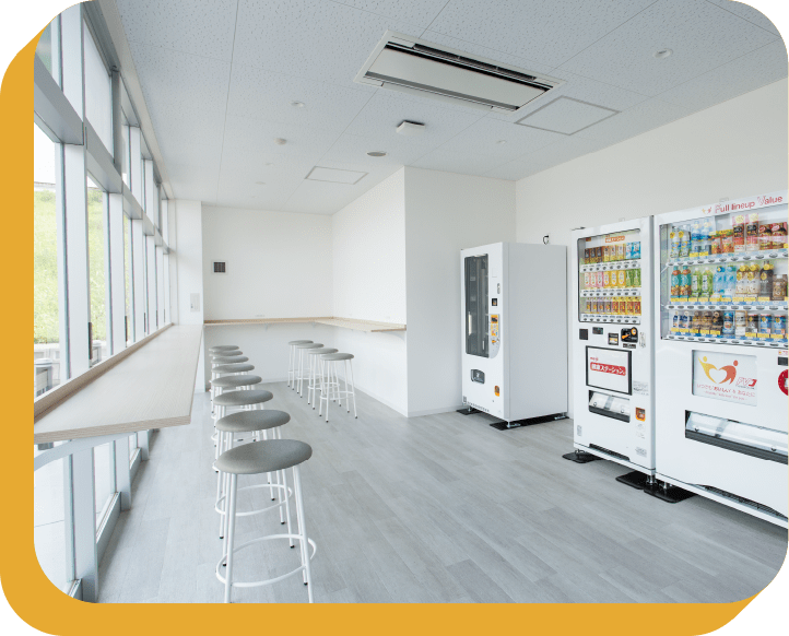 明るく開放的で、教習前もゆったりと過ごせる待合スペース。すぐに食べられるカップ麺やスープ、パンやお菓子などの軽食が買える自動販売機も設置されています。